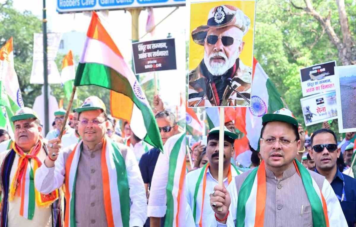 भारतीय सशस्त्र बलों के समर्थन में ऑपरेशन सिंदूर की सफता के बाद राजधानी देहरादून में सीएम पुष्कर सिंह धामी की अगुवाई में तिरंगा यात्रा निकाली गई. जिसमें हजारों की संख्या में आमजन, पूर्व सैनिक, युवा वर्ग और मातृशक्ति ने तिरंगे के साथ पद यात्रा में भाग लिया. सीएम धामी ने इस अवसर पर शौर्य स्थल पर पुष्प चक्र अर्पित कर शहीद जवानों को श्रद्धांजलि भी दी.